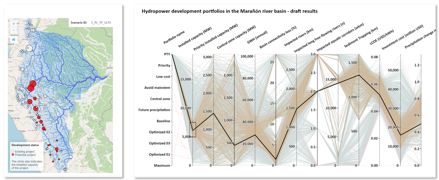 Here, the CSI and the FFR status is used as indicators of impact as part of a system-scale hydropower planning model. The goal of this assessment was to identify future hydropower portfolios that minimize the impact of hydropower development on the Maranon river in Peru.
